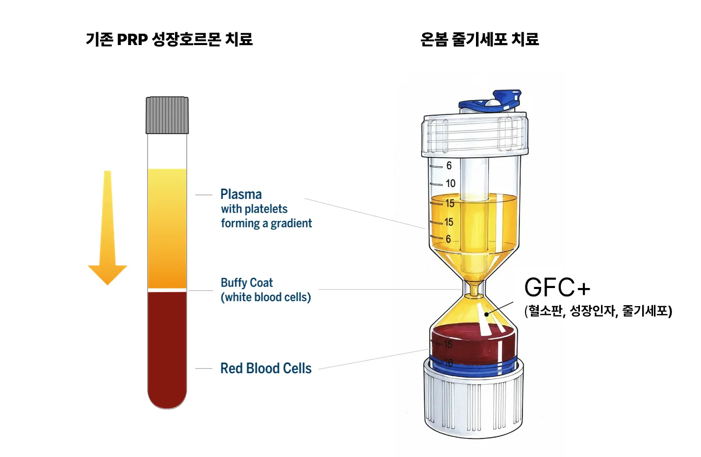 기존 PRP의 한계를 넘어서 기존의 PRP(혈소판 풍부 혈장) 치료는 혈액의 일부인 버피코트(Buffycoat) 층만을 사용했습니다. 하지만 GFC+는 특수 개발된 커넥터를 통해 혈소판, 성장인자, 줄기세포가 가장 풍부하게 모여있는 GFC 층 전체를 추출하여 시술에 활용합니다.